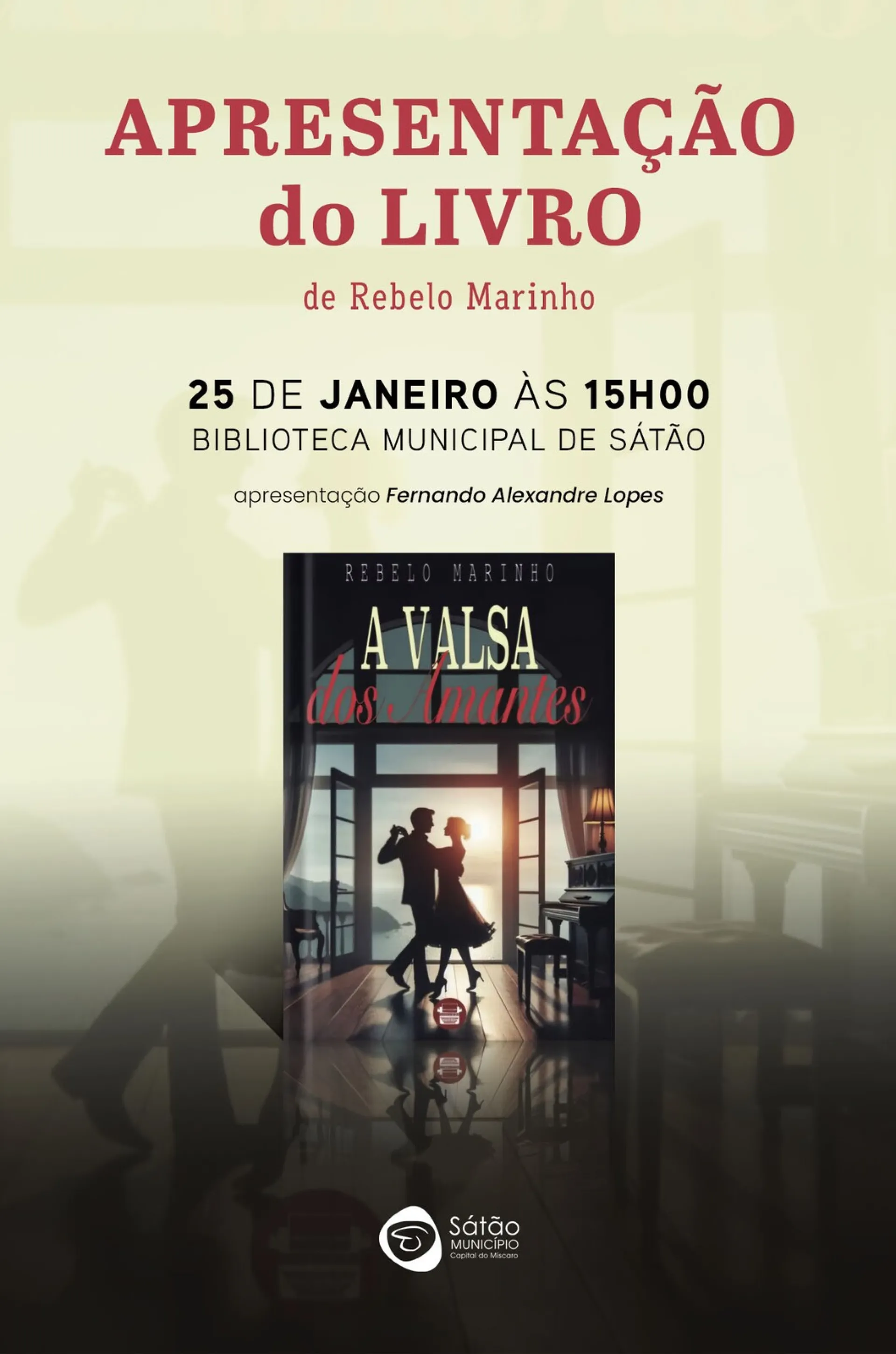 O Presidente da Câmara Municipal de Sátão, Alexandre Manuel Mendonça Vaz, e o autor Rebelo Marinho têm a honra de convidar a população para a Sessão de Lançamento do livro A Valsa dos Amantes, que terá lugar no próximo domingo, dia 25 de janeiro, às 15h00, na Biblioteca Municipal de Sátão.
