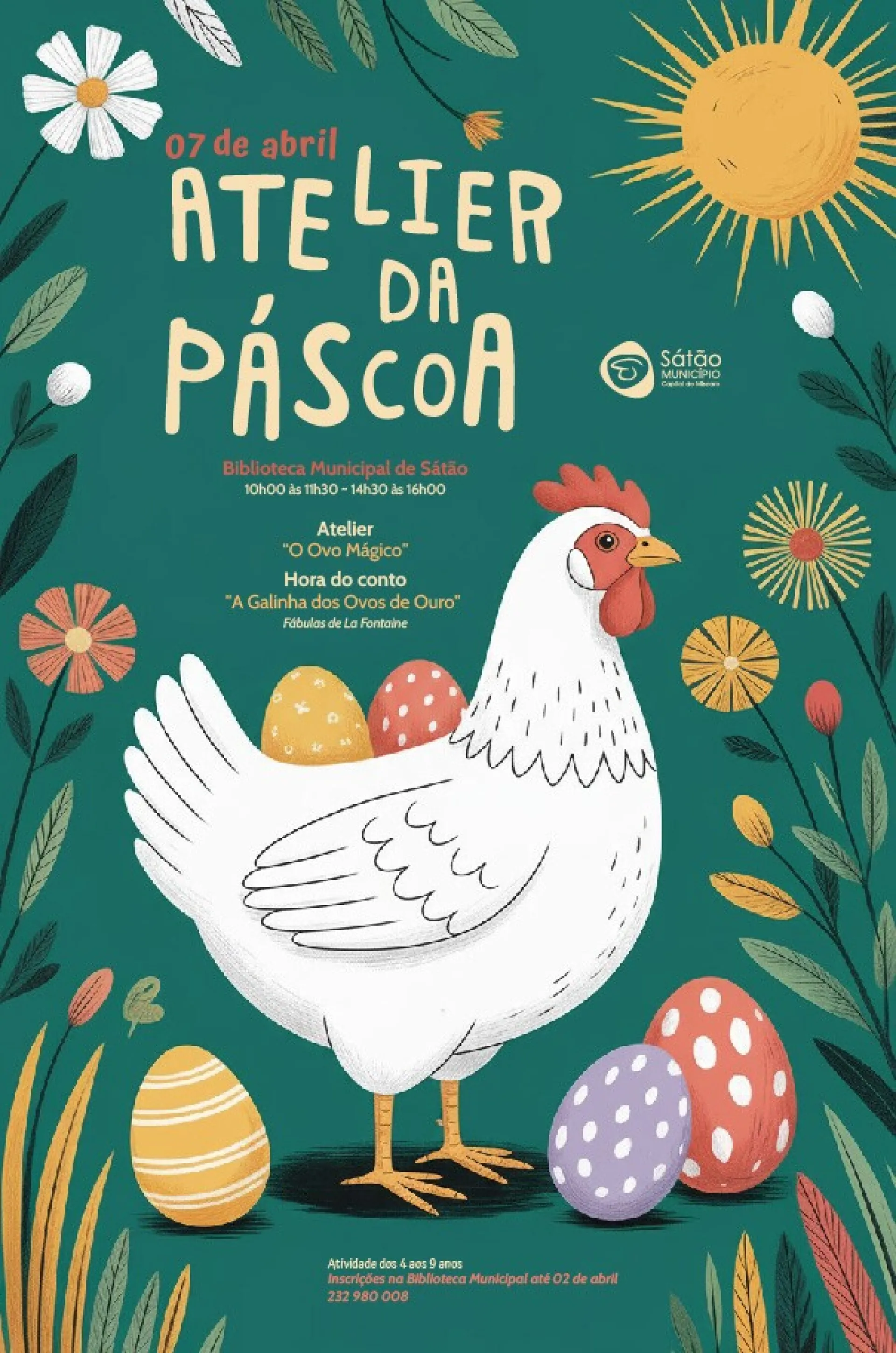 No dia 07 de abril, é apresentado o atelier “O ovo mágico” e a Hora do Conto “A Galinha dos Ovos de Ouro”, para crianças dos 04 aos 09 anos de idade, das 10h00 às 11h30 e das 14h30 às 16h00. Os interessados devem realizar a respetiva inscrição até ao dia 02 de abril, através do número de telefone 232980008 (chamada para a rede fixa nacional).
