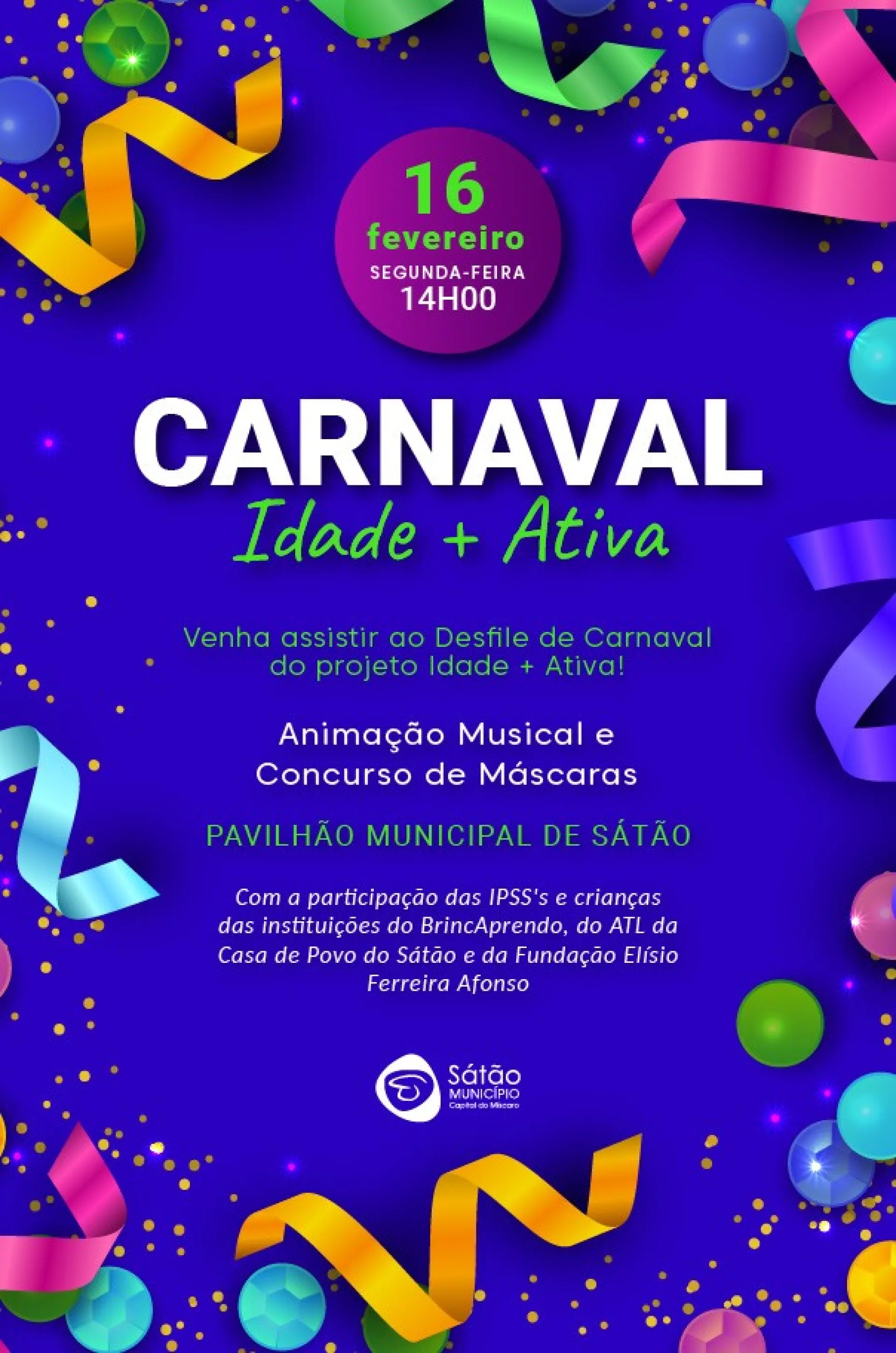 🥳 Carnaval Idade + Ativa!👴👵👧🧒Venha assistir ao Desfile de Carnaval, com animação musical 🧑🎤🎼 e concurso de máscaras 🤡🥸