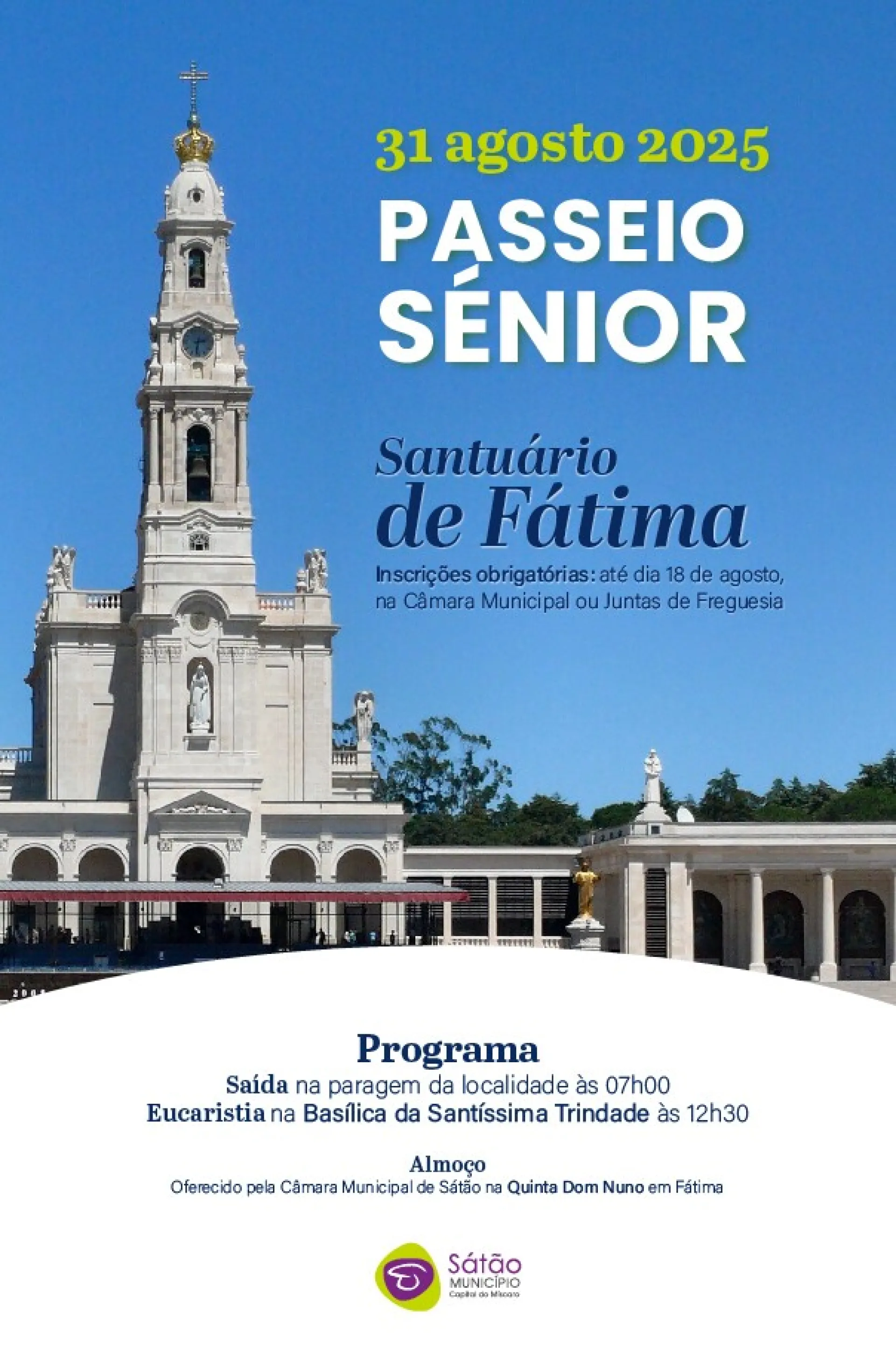 O Município de Sátão assinala o Dia Internacional do Idoso e oferece um passeio totalmente gratuito no dia 31 de agosto de 2025, domingo, a todos os idosos do Concelho a partir dos 65 anos de idade, tendo como destino o Santuário de Fátima. O almoço é oferecido pelo Município de Sátão, na Quinta D. Nuno em Fátima.